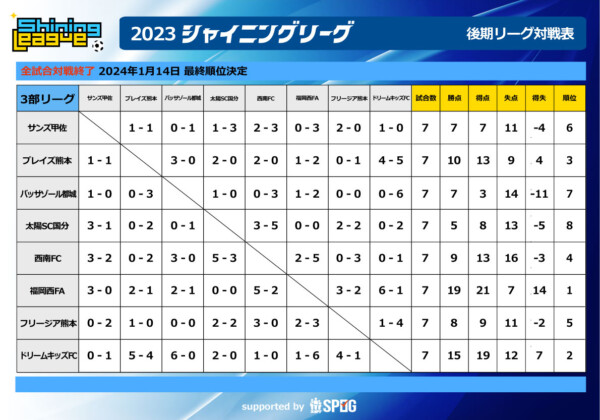 TOP 前期 後期 大会要項 主催 サンズ甲佐 後援 株式会社アイテックス (スポグ|SPOG ) 運営協力 ソレッソグループ/...